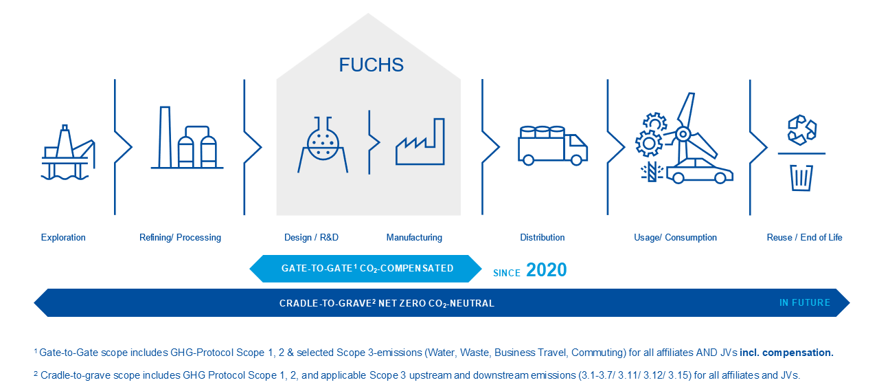 The FUCHS carbon-neutrality strategy is embedded in our sustainability strategy, which began in 2010 when we signed the "Code of Responsible Conduct for Business". In 2018 we joined the "Alliance for Development and Climate" led by the Federal Ministry for Economic Cooperation and Development. FUCHS is an active contributor to and chairing the Joint Sustainability Committee of ATEIL and UEIL. Together, we develop harmonized sustainability standards, KPIs, and benchmarks to enable sustainability-based comparisons.