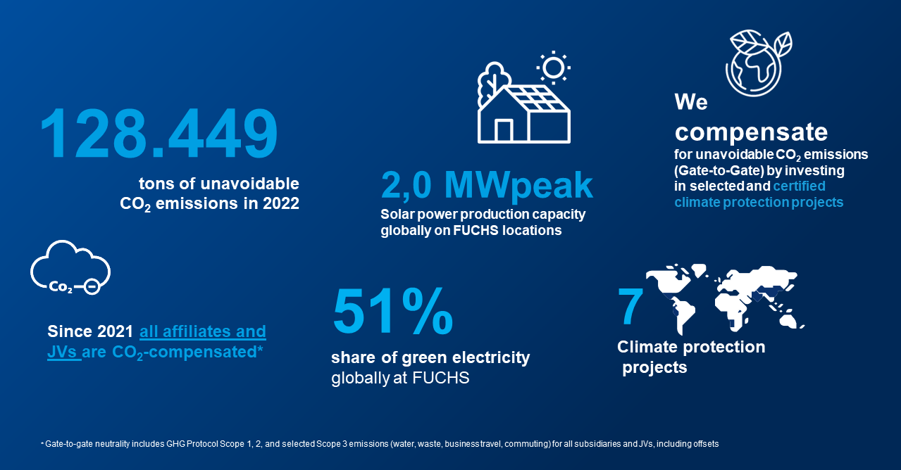 FUCHS voluntarily compensates for its annual Gate-to-gate emissions as long as these could not be reduced to near zero. To do this, all greenhouse gas emissions of FUCHS that are directly attributable to our business activities (“gate-to-gate”) have been measured retroactively since 2019 and offset through investments in climate protection projects. FUCHS restricts its choice of projects for this purpose to high-quality certifications such as UN Gold Standard or VERRA. In any case, compensation measures are only the last step undertaken once avoidance and reduction measures have met their limits. FUCHS is therefore continuously expanding the proportion of renewable energies that make up its power supply, with the aim to transition to 100% Green Electricity by end of 2025.